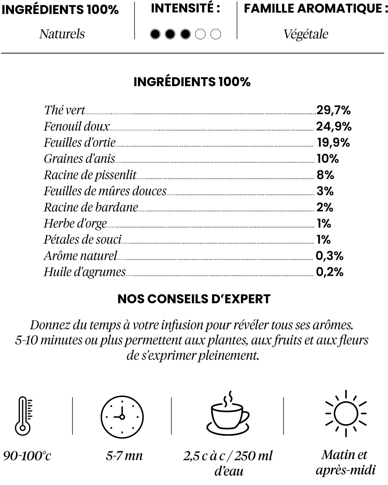 Thé vert: connu pour ses propriétés antioxydantes tout en offrant une douceur agréable et une légère astringence. Fenouil doux: apporte une douce saveur anisée tout en ayant des propriétés digestives bénéfiques. Feuilles d'ortie : riches en nutriments essentiels, contribuant au bien-être général. Graines danis : rafraîchissantes, mais aussi apaisantes pour le système digestif. Racine de pissenlit: appréciée pour ses propriétés de soutien à la détoxification et son rôle dans le maintien d'une digestion saine.