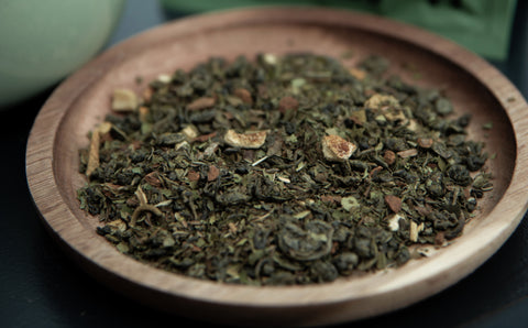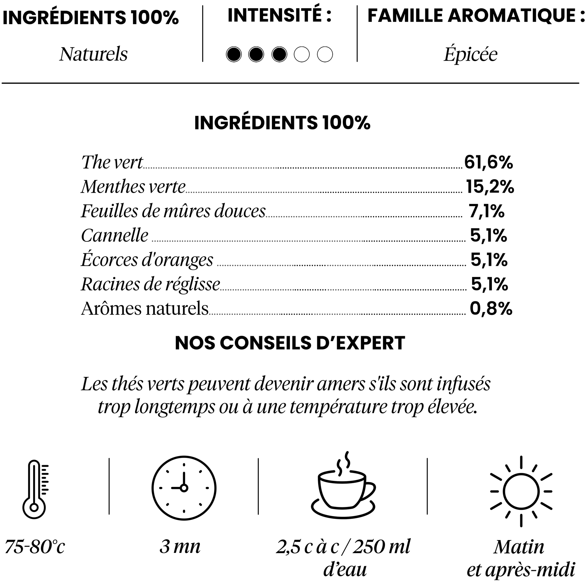 Thé vert : la base de ce mélange. Il apporte des nuances végétales et légèrement herbacées. Menthe verte : une menthe fraîche et aromatique qui ajoute une note vivifiante et revigorante. Cannelle : un soupçon de cannelle apporte une chaleur subtile et une dimension épicée à la recette. Écorces d'agrumes : ces écorces ajoutent une touche d'acidité pétillante et une légère amertume pour équilibrer les saveurs.