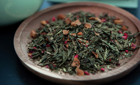 Nos recettes de thé vert incluent Menthe x Cannelle, Cake x Fruits, Cerise x Romarin, et Fleur de Thé x Jasmin.