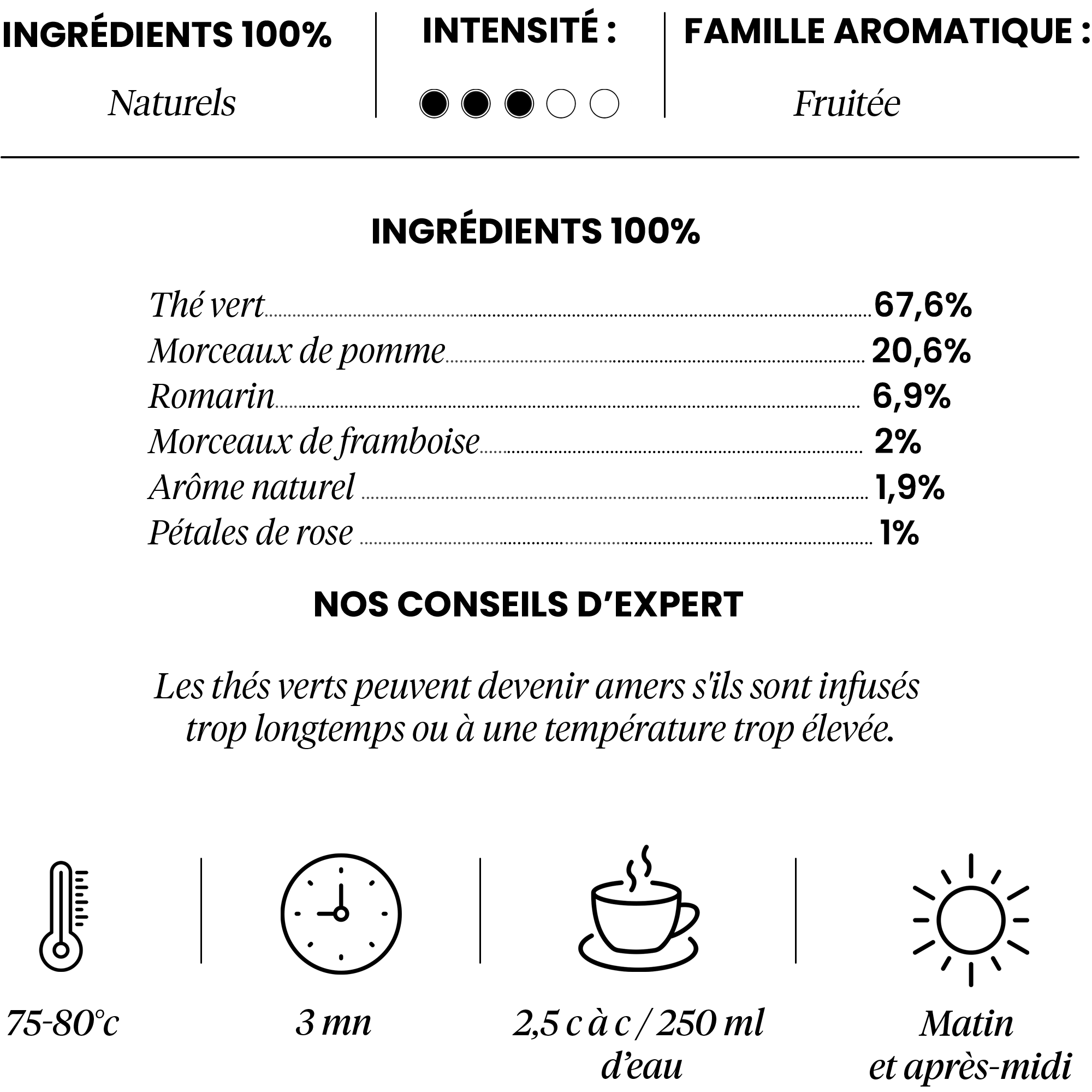 Ce thé vert, base végétale et légèrement herbacée du mélange, s'allie aux notes parfumées du romarin et à la vivacité des morceaux de framboise, créant une harmonie entre douceur florale et fraîcheur fruitée.