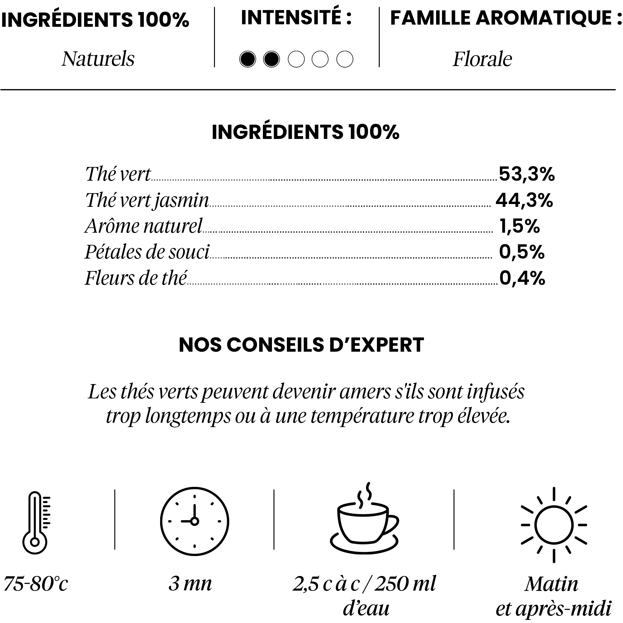 Le thé vert, étoile du mélange, apporte des notes dominantes florales, enrichies par les fleurs de thé et une touche d'arôme naturel, pour une complexité et une profondeur subtiles.