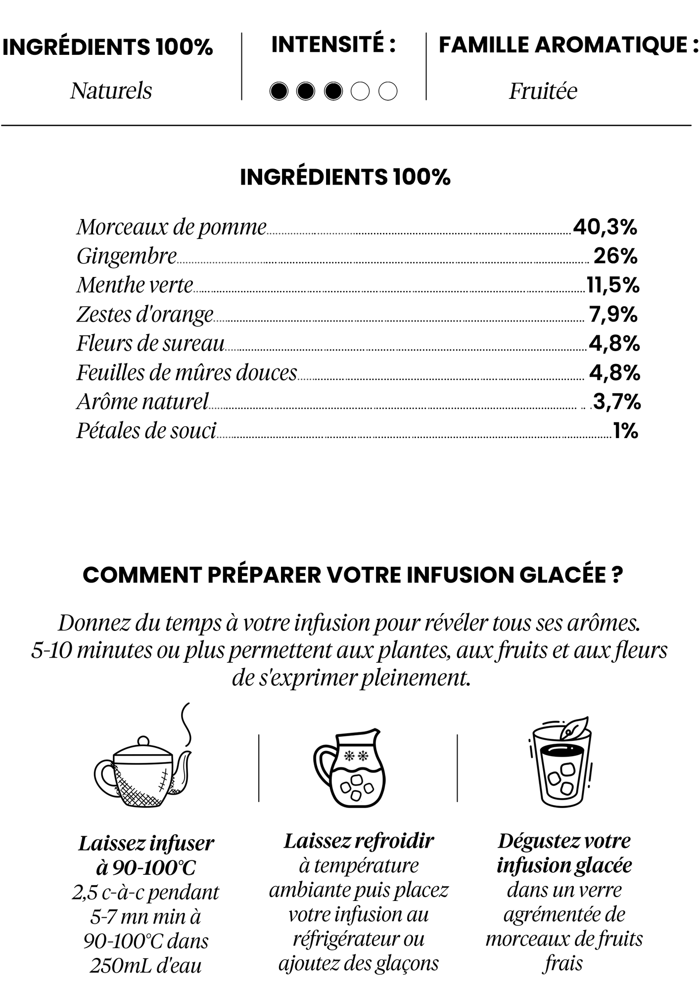 Découvrez une infusion glacée rafraîchissante qui combine la douceur florale du sureau avec le piquant du gingembre. Chaque gorgée de ce mélange offre une sensation de fraîcheur et de vitalité, parfaite pour les journées chaudes d'été.