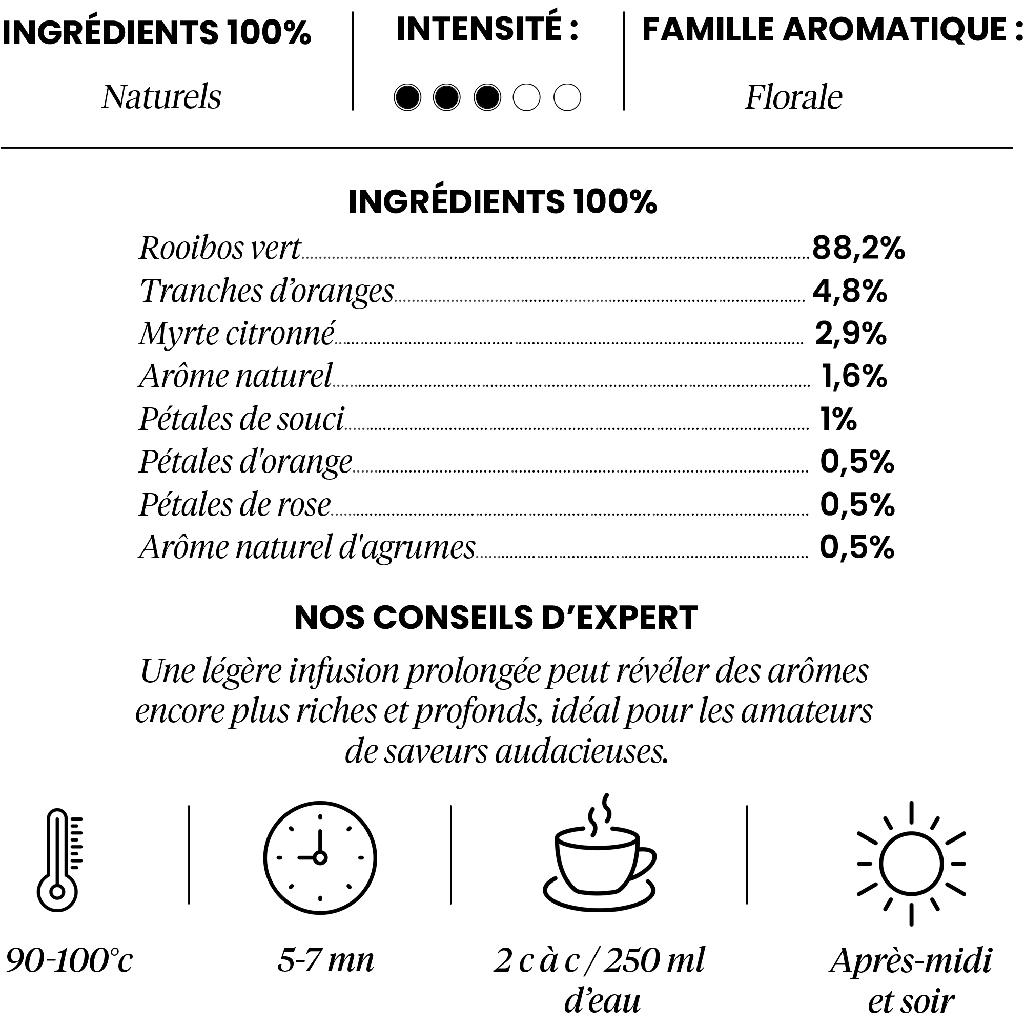 Rooibos vert : notes terreuses et douces qui évoquent une sensation apaisante. Tranches d'oranges: un éclat d'acidité, apportant fraîcheur et vivacité au mélange. Myrte citronné : des nuances citronnées qui rehaussent le profil aromatique. Arôme naturel de fleur d'oranger et de jasmin : pour intensifier la présence des fleurs dans le mélange. Pétales de souci, d'orange et de rose : un trio floral qui enrichit le bouquet de senteurs.