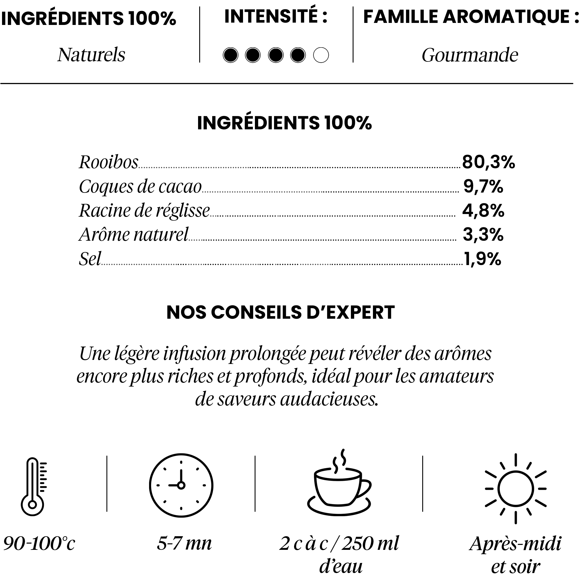 Rooibos : terreux et doux, il évoque la chaleur d'une soirée paisible. Caramel : évoque la sensation du caramel fondant, intensifiant la gourmandise du mélange. Coques de cacao : notes chocolatées qui ajoutent de la profondeur et de la richesse à l'infusion. Racine de réglisse : une douceur naturelle qui rehausse subtilement le profil gourmand de cette recette.
