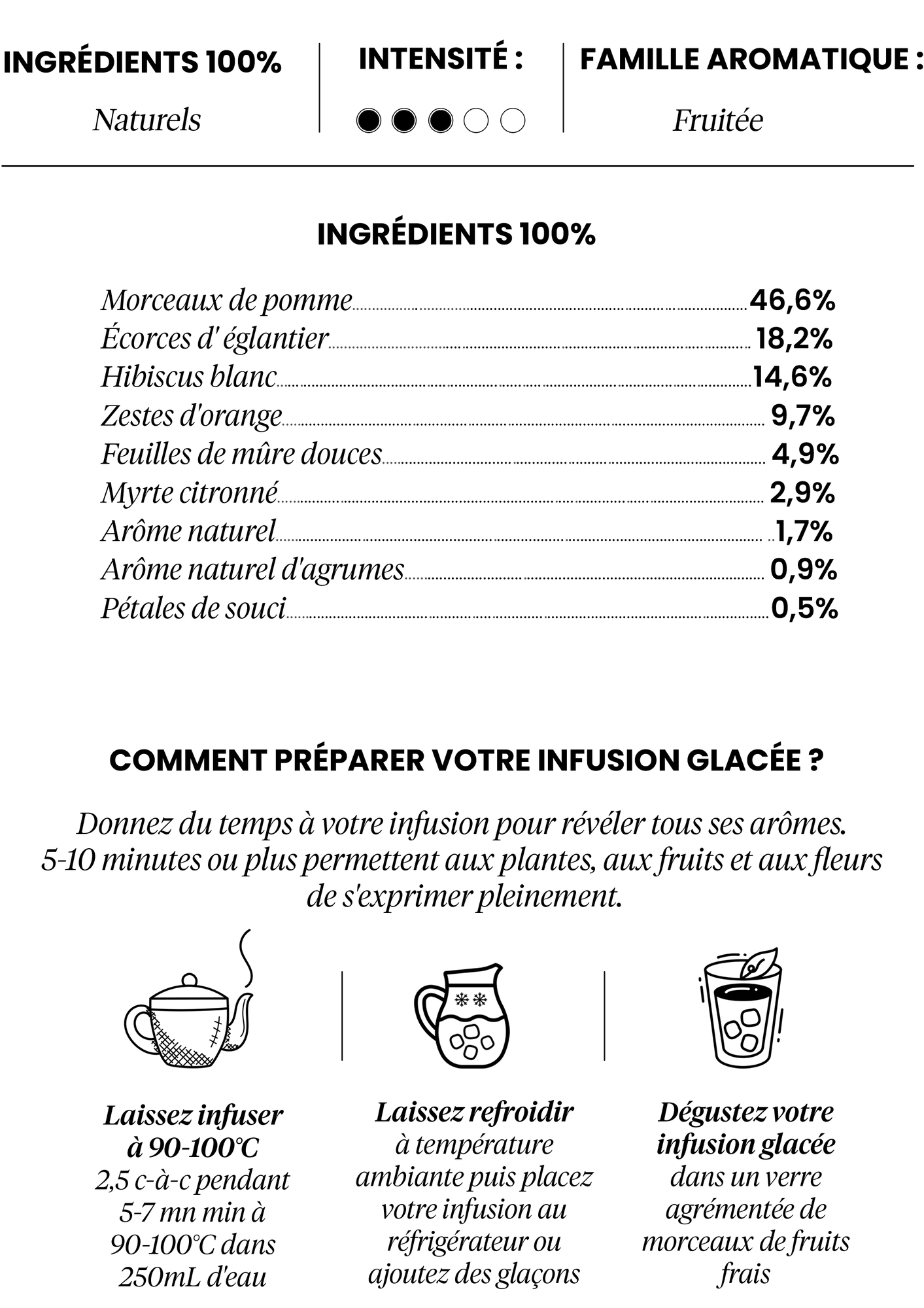 Les notes subtiles de la pomme et du yuzu s’harmonisent pour créer une boisson rafraîchissante et désaltérante, parfaite pour apaiser et revigorer pendant les journées estivales. Une infusion équilibrée et sophistiquée qui transforme chaque moment en une expérience de détente estivale.